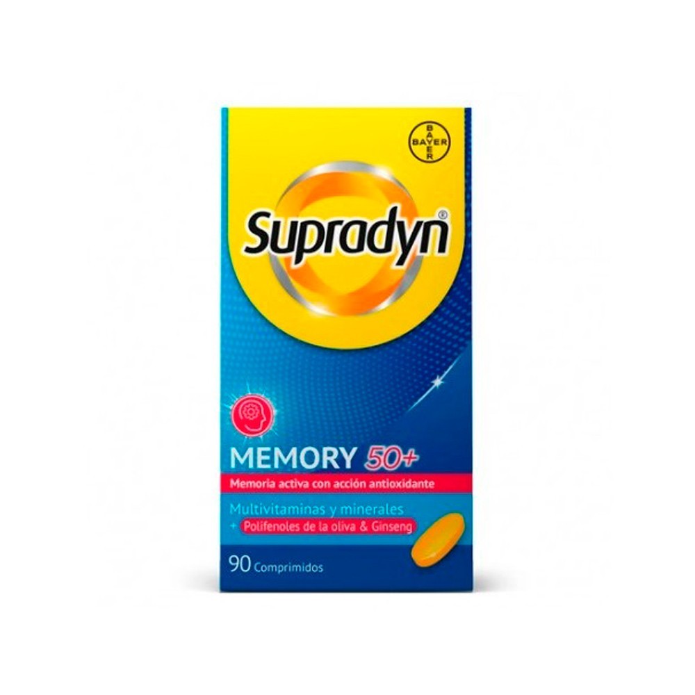 Supradyn® Memory 50+ es un complemento alimenticio específicamente formulado para personas mayores de 50 años, a base de 12 vitaminas y 9 minerales que aportan energía y vitalidad, con polifenoles de la oliva de potente acción antioxidante, y ginseng de origen natural que ayuda a la concentración y el rendimiento mental.