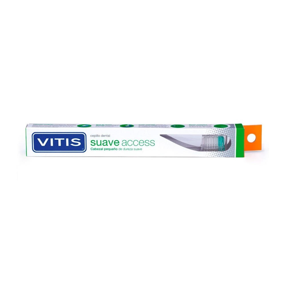 VITIS® suave access es un cepillo de uso diario con cabezal de tamaño pequeño que permite acceder fácilmente a las zonas posteriores de la boca y disminuir los posibles reflejos nauseosos.
